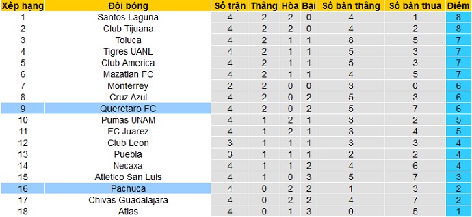 Bảng xếp hạng giải VĐQG Mexico trước vòng 5