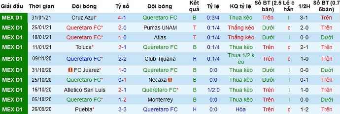 + Thống kê 10 trận gần nhất của Querétaro