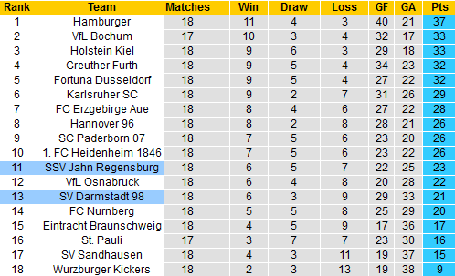 Không những bị nhóm đua tranh vé thăng hạng bỏ lại khoảng cách điểm rất xa, Darmstadt còn phải đối mặt với nguy cơ tụt xuống khu vực nguy hiểm. Qua giai đoạn lượt đi, Darmstadt chỉ còn hơn vị trí phải đá play-offs trụ hạng 5 điểm nhưng đá nhiều hơn 1 trận.