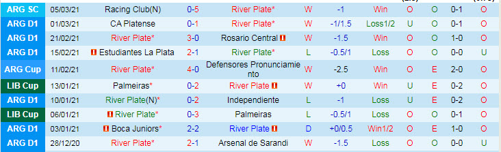 + Thống kê 10 trận gần nhất của River Plate