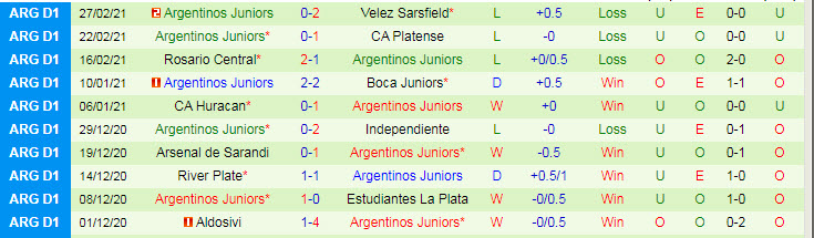 + Thống kê 10 trận gần nhất của Argentinos Juniors