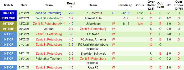 8/9 trận sân khách của Zenit thuộc khuôn khổ Russian Premier League 2020/21 không chứng kiến quá 2 pha lập công. Kịch bản tương tự hứa hẹn tái diễn khi Zenit làm khách trước Rubin Kazan.