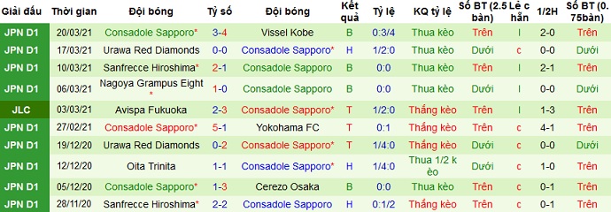 + Thống kê 10 trận gần nhất của Consadole Sapporo