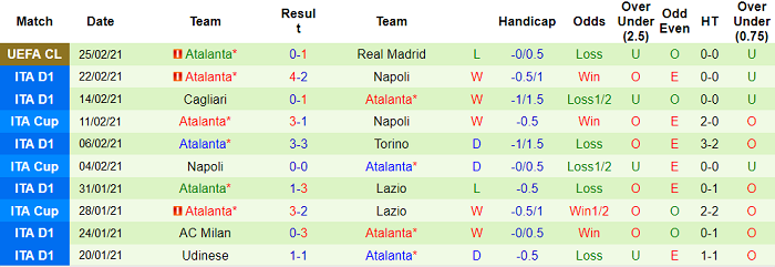 - Thống kê 10 trận gần nhất của Atalanta