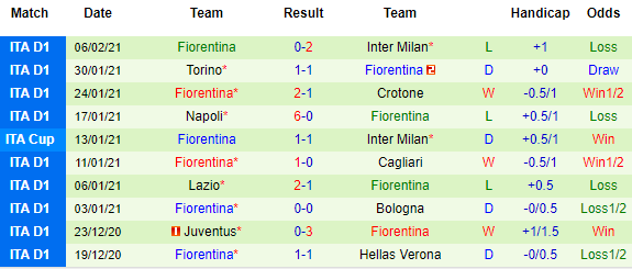 + Thống kê 10 trận gần nhất của Fiorentina