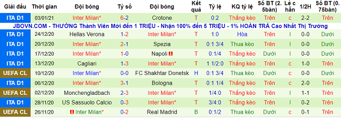 Inter Milan thắng theo tỷ lệ châu Á tới 6/8 trận gần nhất thuộc khuôn khổ Serie A. Trên sân khách, họ thắng theo tỷ lệ châu Á cũng ở 6/8 trận vừa qua.