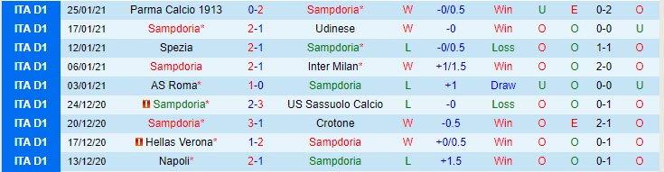+ Thống kê 10 trận gần nhất của Sampdoria