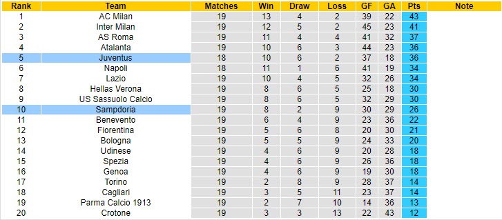 Đây là trận đấu khó đoán bởi Sampdoria đang có được sự tự tin khi thắng 2 trận mới đây. Dẫu vậy, Juventus lại chiếm ưu thế nhờ thành tích đối đầu tốt trước đối thủ. Cụ thể, Juventus từng thắng tới 19 trận, hòa 7 và thua có 6 trận trong số 32 trận đối đầu gần nhất trước Sampdoria.