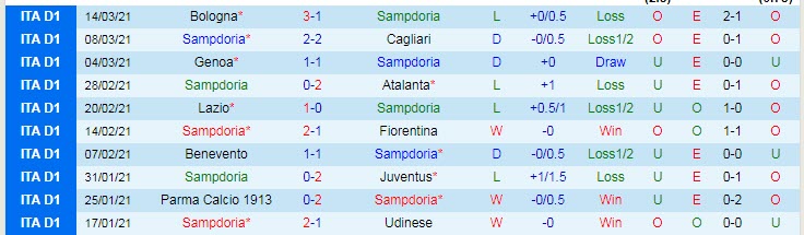 + Thống kê 10 trận gần nhất của Sampdoria