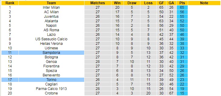 Bên kia sân, Torino đang trong tình cảnh không mấy vui vẻ khi đứng ở vị trí thứ 17 trên BXH – vị trí ngay trên nhóm 3 đội cầm đèn đỏ. Chi tiết, họ có được 23 điểm và hơn nhóm xuống hạng đúng 1 điểm.