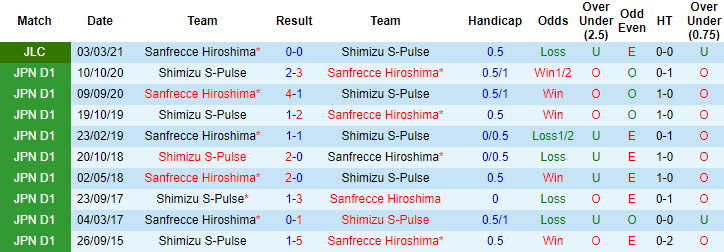 Sanfrecce Hiroshima có thành tích đối đầu ấn tượng trước Shimizu S-Pulse ở những mùa giải gần đây. 3 lần gần nhất chạm trán Sanfrecce Hiroshima trong khuôn khổ giải VĐQG Nhật Bản, Shimizu S-Pulse toàn thua, thủng lưới 9 lần. Vì vậy nên không bất ngờ khi Sanfrecce Hiroshima được đánh giá cao hơn đổi thủ ở lần tái đấu sắp tới trên sân nhà.
