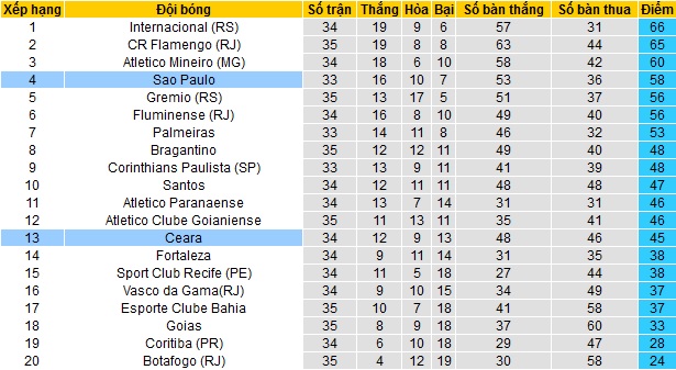 Bảng xếp hạng giải VĐQG Brazil vòng 35