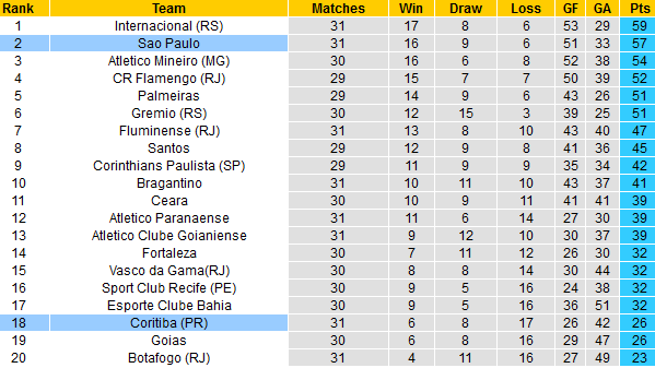 Ở vòng gần nhất đã chứng kiến Sao Paulo mất vị trí dẫn đầu vào tay Internacional khi họ thua tan nát chính đối thủ ngay trên sân nhà với tỷ số 1-5. Đó là kết quả thực sự đáng tiếc nhưng lại hoàn toàn hợp lý với phong độ đi xuống thảm hại gần đây của Dani Alves cùng các đồng đội.
