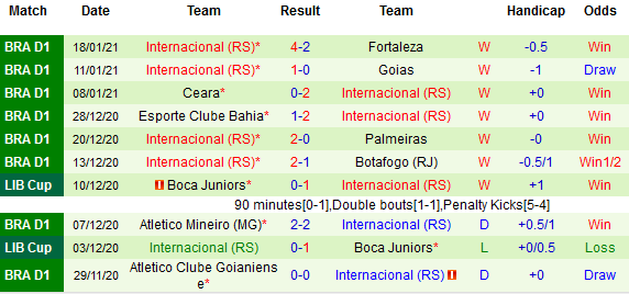 Trong khi đó, Internacional lại có sự chuẩn bị rất đáng hy vọng với 8 vòng liên tiếp đều bất bại tại Serie A, trong đó 6 trận gần đây toàn thắng. Đây là sự khác biệt đáng kể để tin vào đội khách.