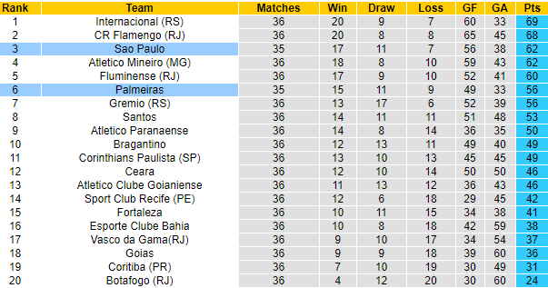 Kể cả có thắng trận đá bù này thì Sao Paulo vẫn kém đội dẫn đầu 4 điểm trong khi chỉ còn 2 vòng trước mắt. Phía đối diện, Palmeiras cũng chơi không thực sự tốt ở mùa giải năm nay, và hiện họ cũng cần nỗ lực để giữ vững vị trí thứ 6 – thứ hạng cuối cùng được dự vòng loại Copa Libertadores.