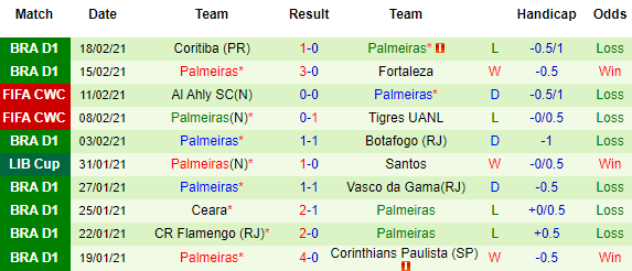 + Thống kê 10 trận gần nhất của Palmeiras