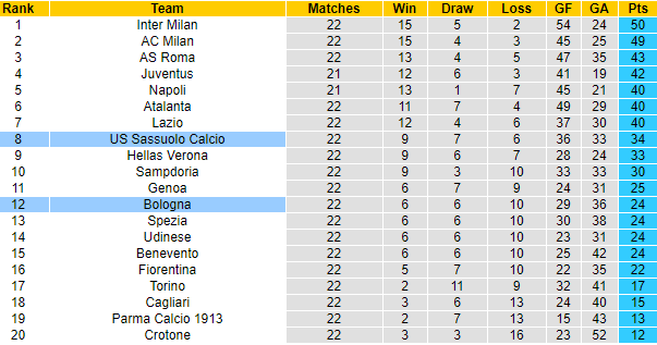 Bên phía đối diện, Bologna cũng không được đánh giá cao và mục tiêu với họ chỉ là trụ hạng. Đến lúc này, Bologna cũng an toàn với khoảng cách 9 điểm nhiều hơn vị trí cầm đèn đỏ gần nhất. Cách biệt như vậy tạm thời giúp cho Bologna không cần lo lắng.