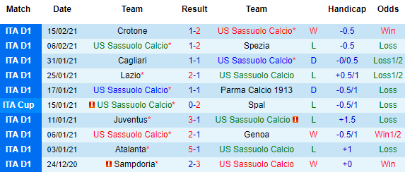 + Thống kê 10 trận gần nhất của Sassuolo