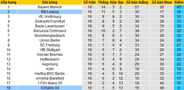 Trái lại, RB Leipzig chơi có phần còn tiến bộ hơn so với mùa giải trước và hiện vẫn đang duy trì được vị trí thứ nhì trên bảng xếp hạng. Với 38 điểm có được sau 19 vòng đấu, RB Leipzig đang có nhiều hơn đội đứng thứ ba Wolfsburg 3 điểm nhưng bị đội đầu bảng Bayern Munich bỏ cách tới 7 điểm.