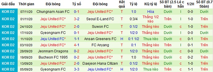 Thành tích của Jeju United rất ấn tượng khi đội bóng bất bại trong cả 16 trận đấu gần nhất, trong đó có 12 trận thắng và 4 trận hòa. Ngay trên sân khách Jeju United cũng bất bại 6 trận du đấu gần đây, trong đó có 4 trận thắng gần nhất.