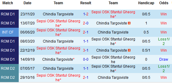 + Lịch sử đối đầu Sepsi vs Chindia Targoviste