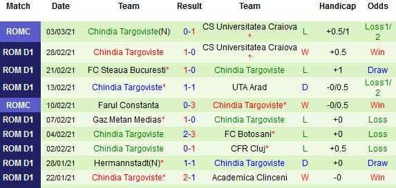 + Thống kê 10 trận gần nhất của Chindia Targoviste