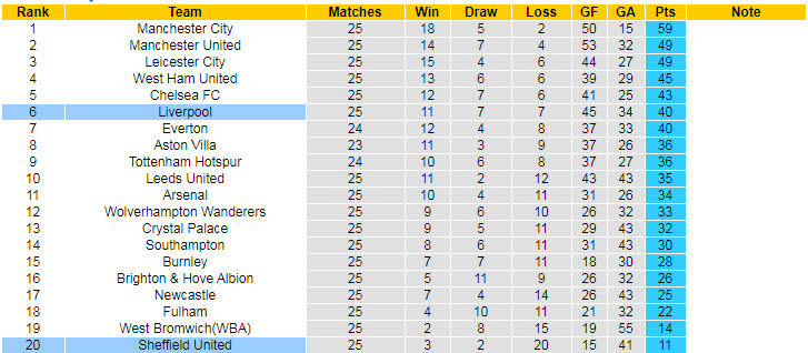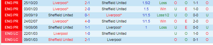 Phong độ và thống kê đối đầu Sheffield United - Liverpool gần đây: