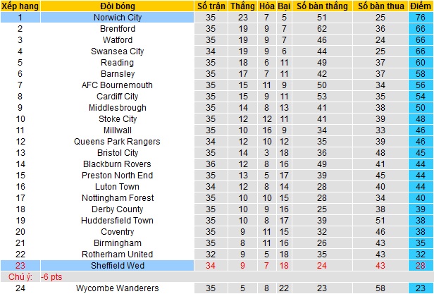Trận đấu muộn nhất của vòng 36 giải hạng nhất Anh sẽ là cuộc đọ sức giữa hai đội bóng đang có tình cảnh trái ngược nhau, Sheffield Wed và Norwich City. Do vi phạm về luật an toàn tài chính, Sheffield Wed phải nhận án phạt từ Hiệp hội bóng đá Anh trong mùa giải này. Thế nên Sheffield Wed bắt đầu mùa giải với -6 điểm.
