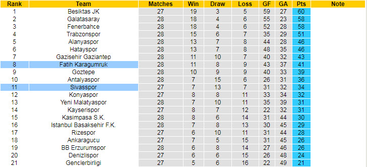 Sivasspor đang cho thấy những dấu hiệu hụt hơi khi để chia điểm 3 vòng đấu vừa rồi tại giải VĐQG Thổ Nhĩ Kỳ. Với phong độ kể trên, họ đã rơi xuống vị trí thứ 11 trên BXH và vẫn còn đó nguy cơ xuống hạng.