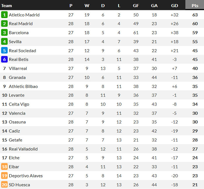Niềm vui liên tiếp nhân đôi với Barca bởi quãng thời gian họ ‘thăng hoa’ trùng với thời điểm Atletico Madrid ‘xuống dốc’. Nhờ đó, khoảng cách giữa họ sau vòng 27 chỉ còn là 4 điểm.