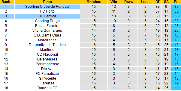 BẢNG XẾP HẠNG VĐQG Bồ Đào Nha