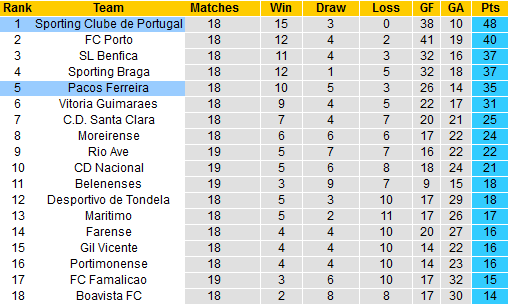 Không phủ nhận những nỗ lực rất đáng khen của Pacos Ferreira ở mùa giải năm nay. Đội khách đã leo lên vị trí thứ 5 khi chỉ xếp sau nhóm 4 đội dẫn đầu với khoảng cách 4 điểm nhiều hơn nhóm bám đuổi.