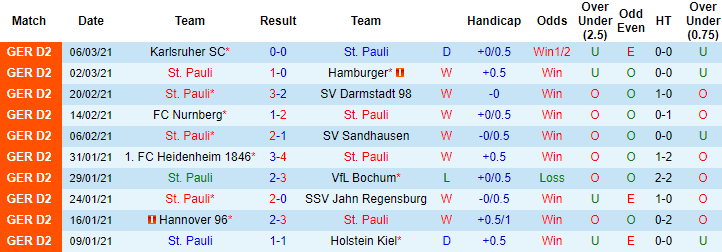 + Thống kê 10 trận gần nhất của St. Pauli