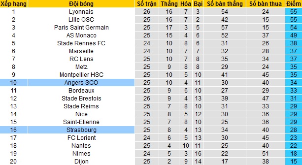 Trong khi đó Angers đang đứng giữa bảng xếp hạng ở vị trí thứ 10 với 34 điểm sau 25 vòng đấu. Tuy nhiên đây không phải là điều bất ngờ khi mùa trước họ cũng chỉ đứng thứ 11. Hiện tại khoảng cách của Angers với các đội Top 5 cũng chỉ là 4 điểm nhưng đang bị các đội cạnh tranh rất quyết liệt.