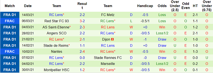 - Thống kê 10 trận gần nhất của Lens