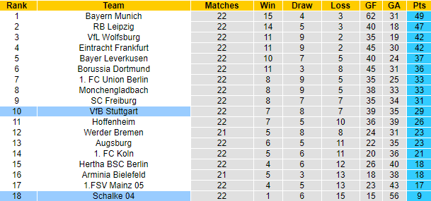 Trên bảng xếp hạng Bundesliga, Stuttgart đang xếp thứ 10 với 29 điểm sau 22 trận. Với số trận tương tự, Schalke mới giành được 9 điểm, xếp ở vị trí đội sổ. 8 trận liên tiếp gần đây tính trên mọi đấu trường, Schalke không biết đến mùi chiến thắng (thua 6, hoà 2). Trận đấu sắp tới Schalke vắng 10 cầu thủ đội 1 vì chấn thương và nhiễm Covid-19.