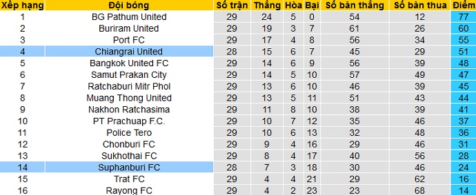 Bảng xếp hạng giải VĐQG Thái Lan vòng 29