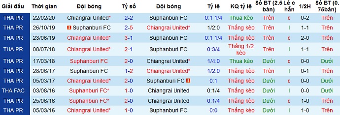 + Lịch sử đối đầu Suphanburi FC vs Chiangrai United