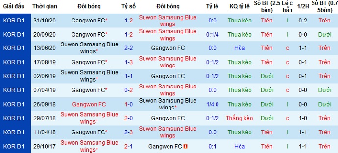 Trong 4 lần đối đầu gần nhất, Suwon Bluewings giành chiến thắng tới 3 trận và chỉ để hòa 1 trận. Ngoài ra Suwon Bluewings cũng đang thắng cả 2 trận sân nhà từ đầu mùa, trong khi Gangwon FC thua cả 3 trận đã đấu. Thế nên chọn cửa trên là hoàn toàn có cơ sở và hợp lý.