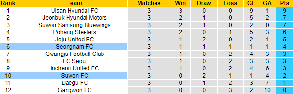 Bằng chứng là việc họ cầm hòa Daegu và Suwon Bluewings, những đối thủ được đánh giá cao hơn Suwon. Đối thủ của Suwon ngày hôm nay, Seongnam cũng chẳng phải là tên tuổi nặng ký ở K-League lúc này. Sau 3 vòng, Seongnam có 1 chiến thắng và 1 trận hòa, thành tích cũng không quá tệ.