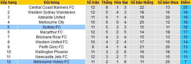 Bảng xếp hạng giải VĐQG Úc vòng 12