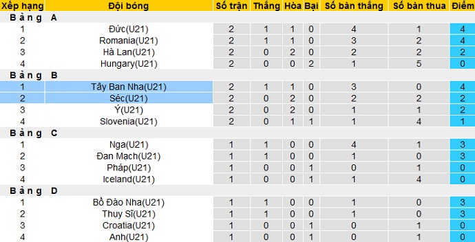 Xếp hạng vòng bảng EURO U21