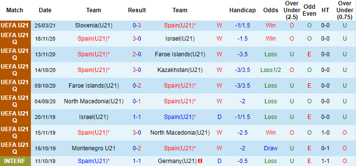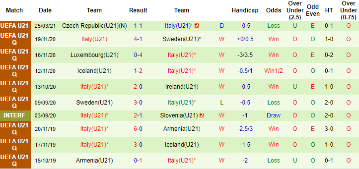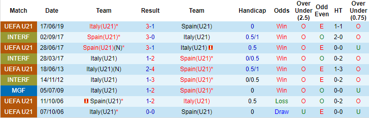 Trong vòng 9 lần chạm trán Tây Ban Nha U21 trước đây, Italy U21 bị đánh bại tới 6 lần, còn lại là 1 trận hòa và 2 chiến thắng. Đáng chú ý, khi chấp -3/4 theo kèo châu Á khi đối đầu Italy U21 trong quá khứ, Tây Ban Nha đều giành chiến thắng với cách biệt 2 bàn trở lên. Trận đấu sắp tới Tây Ban Nha U21 tiếp tục chấp -3/4.