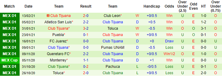 2 lần chạm trán Tigres UANL gần đây, Club Tijuana đều giành được 1 điểm. 8 trận vừa qua ở mọi giải đấu, Club Tijuana bất bại với 3 thắng, 5 hoà. Trong khi đó Tigres UANL cho thấy dấu hiệu tụt dốc với 2 thất bại liên tiếp vừa qua.