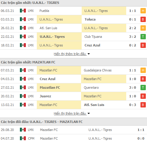 Phong độ và thống kê đối đầu gần đây Tigres UANL vs Mazatlan: