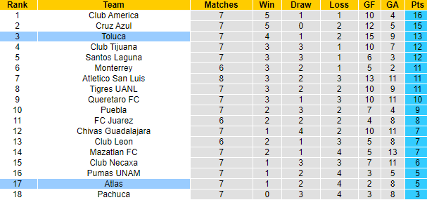 Sau 7 trận tại giải VĐQG Mexico mùa này, Toluca đã giành được 13 điểm, hiện đang xếp thứ 3 trên bảng xếp hạng. Trong khi đó Club Atlas với số trận tương tự mới giành được 5 điểm, xếp ở vị trí thứ 17. Thành tích vượt trội cùng với việc được thi đấu trên sân nhà, Toluca cho thấy họ rất hứa hẹn vào khả năng giành chiến thắng trong 90 phút tranh tài sắp tới về mặt lý thuyết.