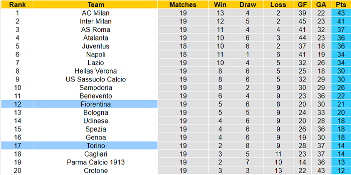 Phong độ và thống kê đối đầu Torino - Fiorentina