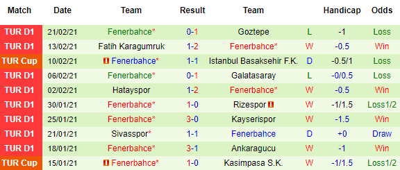 + Thống kê 10 trận gần nhất của Fenerbahce