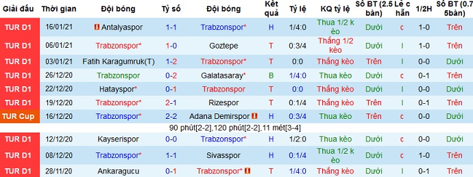Thành tích hồi đầu mùa giải của Trabzonspor là khá tệ nhưng đã phần nào được cải thiện trong thời gian gần đây. Ở 5 trận đấu gần nhất Trabzonspor cũng có được 3 trận thắng, hòa 1 và để thua 1. Thành tích sân nhà của đội bóng cũng không hề kém khi cũng có được 3 trận thắng, 1 trận hòa và để thua 1 trận trong 5 trận gần nhất tại đây.