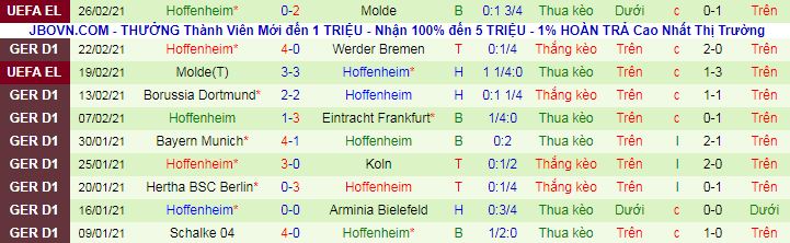 + Thống kê 10 trận gần nhất của Hoffenheim